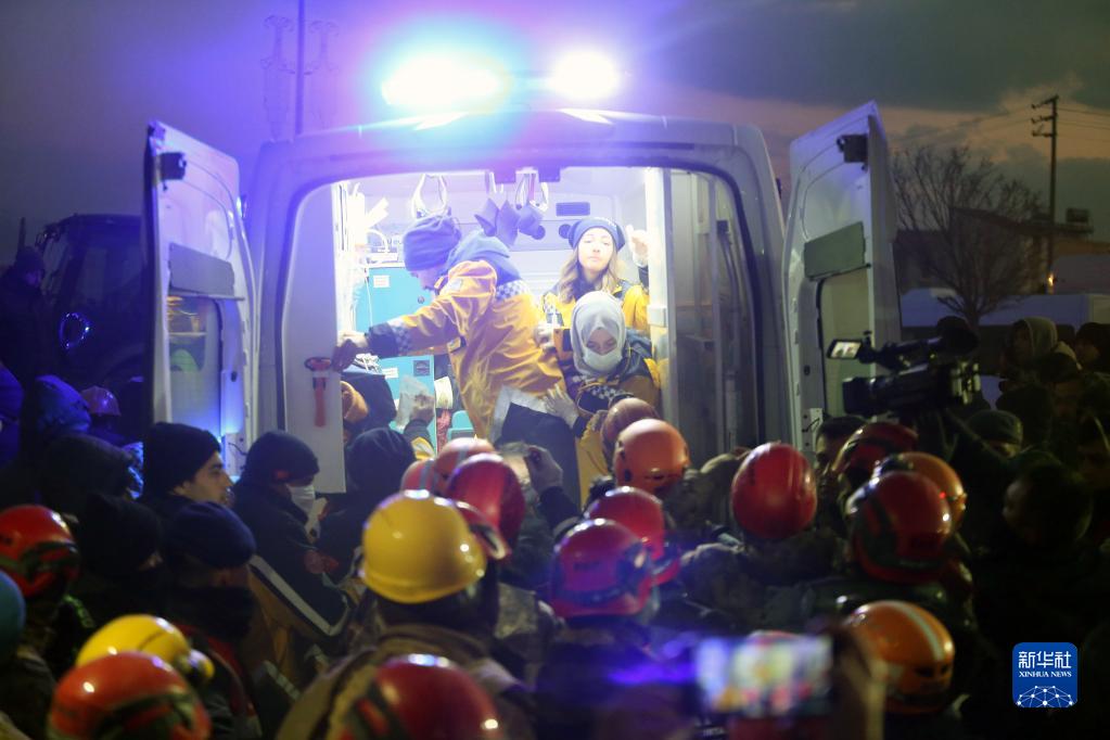 2月10日晚,在土耳其加濟(jì)安泰普省,救援人員轉(zhuǎn)移獲救的幸存者。