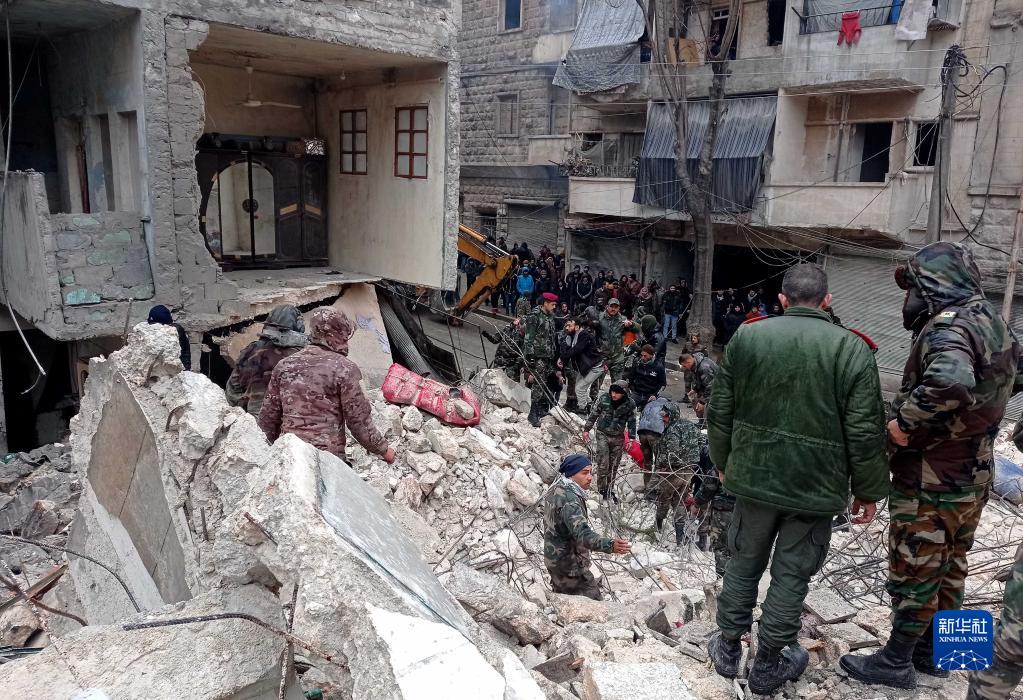 2月6日,人們在敘利亞阿勒頗省一處倒塌的建筑現(xiàn)場進(jìn)行救援。