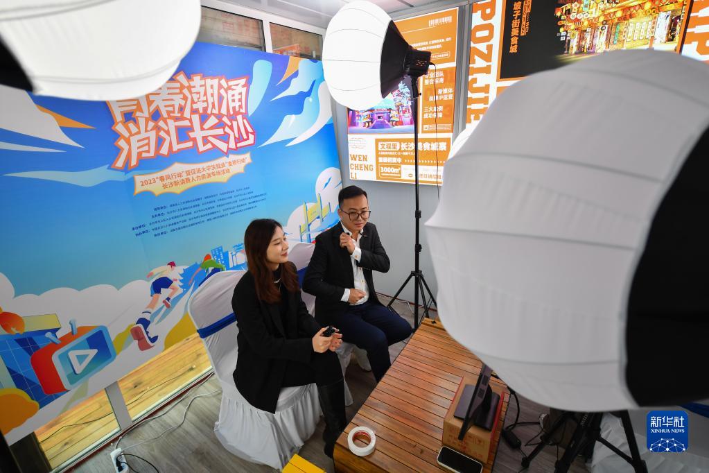 2月11日,在長沙市天心區(qū)黃興南路步行街,工作人員在招聘活動現(xiàn)場直播介紹崗位信息。