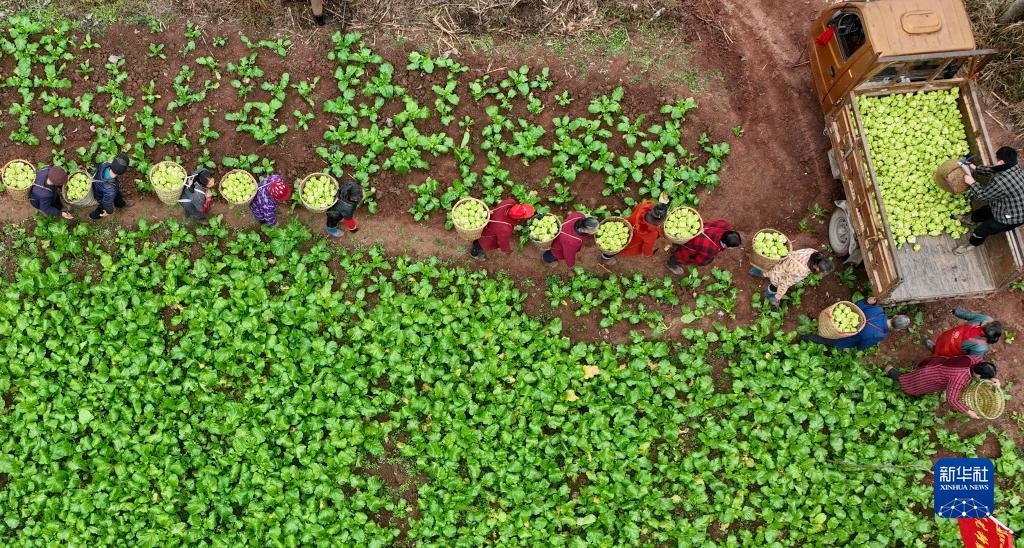 2月10日,南充市嘉陵區(qū)安福鎮(zhèn)埡子口村的村民將收獲的青菜頭裝車(無人機照片)。