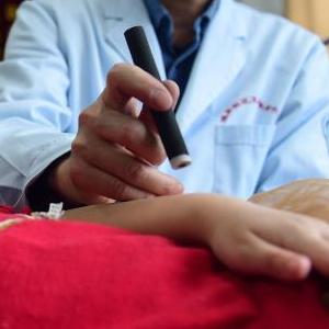 2月11日,滄州市新華區道東社區衛生服務中心“國醫堂”中醫為患者進行艾灸治療。