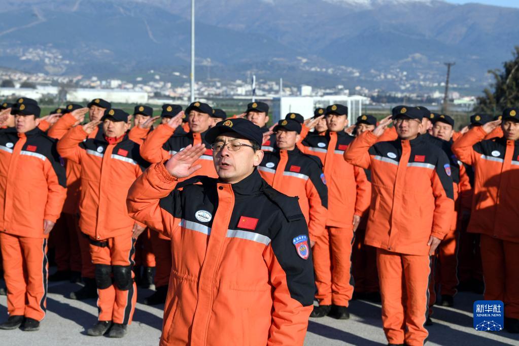 2月10日,中國救援隊(duì)隊(duì)員在土耳其哈塔伊省安塔基亞市的駐扎營區(qū)參加升旗儀式。