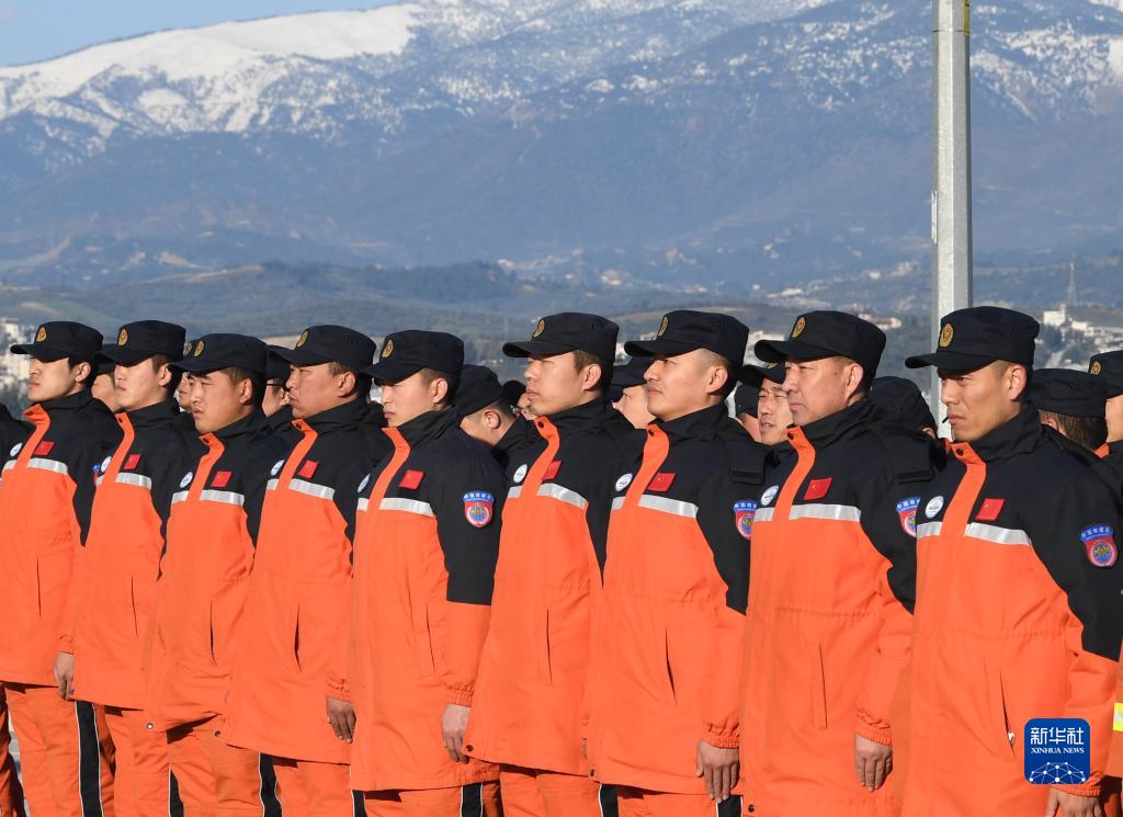 2月10日,中國救援隊隊員在土耳其哈塔伊省安塔基亞市的駐扎營區參加升旗儀式。