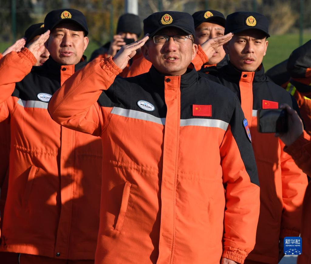 2月10日,中國救援隊隊員在土耳其哈塔伊省安塔基亞市的駐扎營區參加升旗儀式。