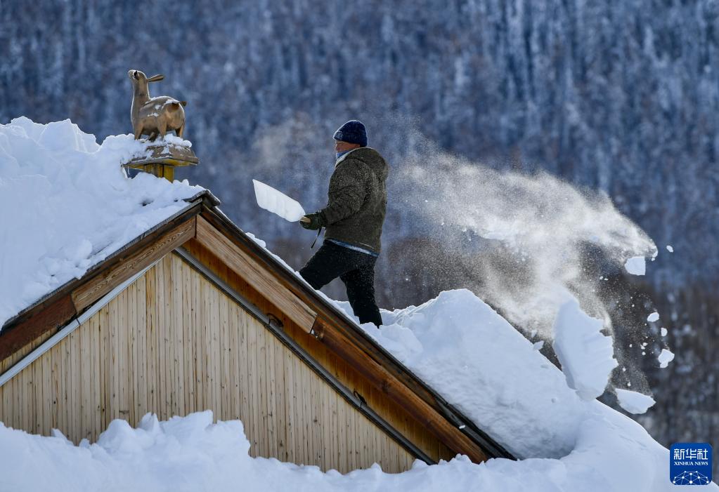 新疆阿勒泰地區禾木村村民清掃屋頂積雪(2023年1月14日攝)。新華社記者 胡虎虎 攝