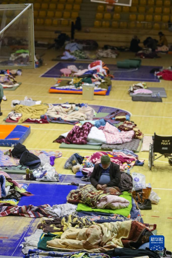 2月11日,受地震影響的人們?cè)谕炼涔潦“菜鶃喪械囊粋€(gè)體育館休息。