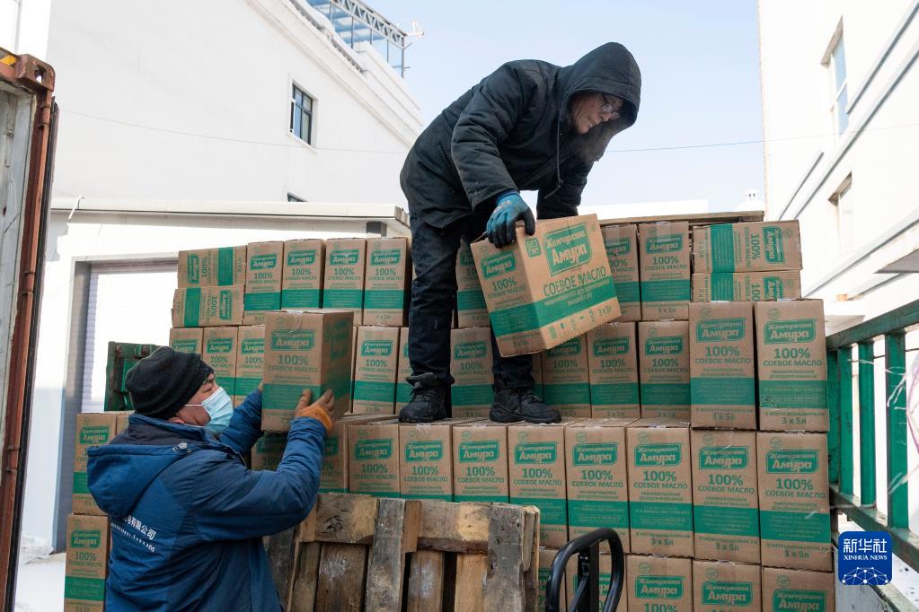 2月11日,工人在中國(黑龍江)自由貿易試驗區黑河片區搬運進口貨物。