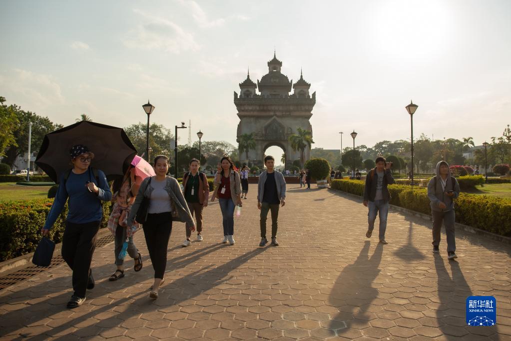 2月7日,游客在老撾首都萬象凱旋門附近游覽。