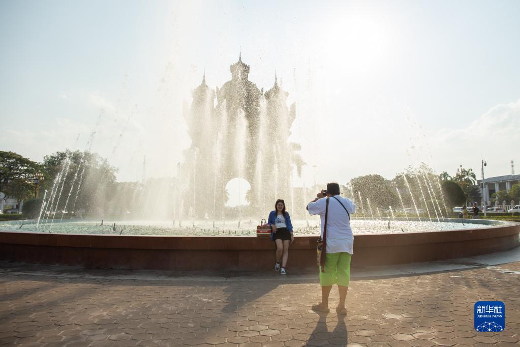 2月7日,游客在老撾首都萬象凱旋門附近留影。