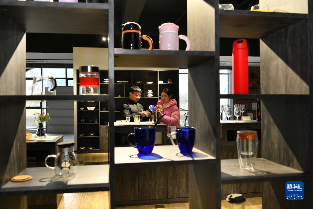2月11日,客商在河北省河間市一家工藝玻璃制品生產企業展廳內參觀。