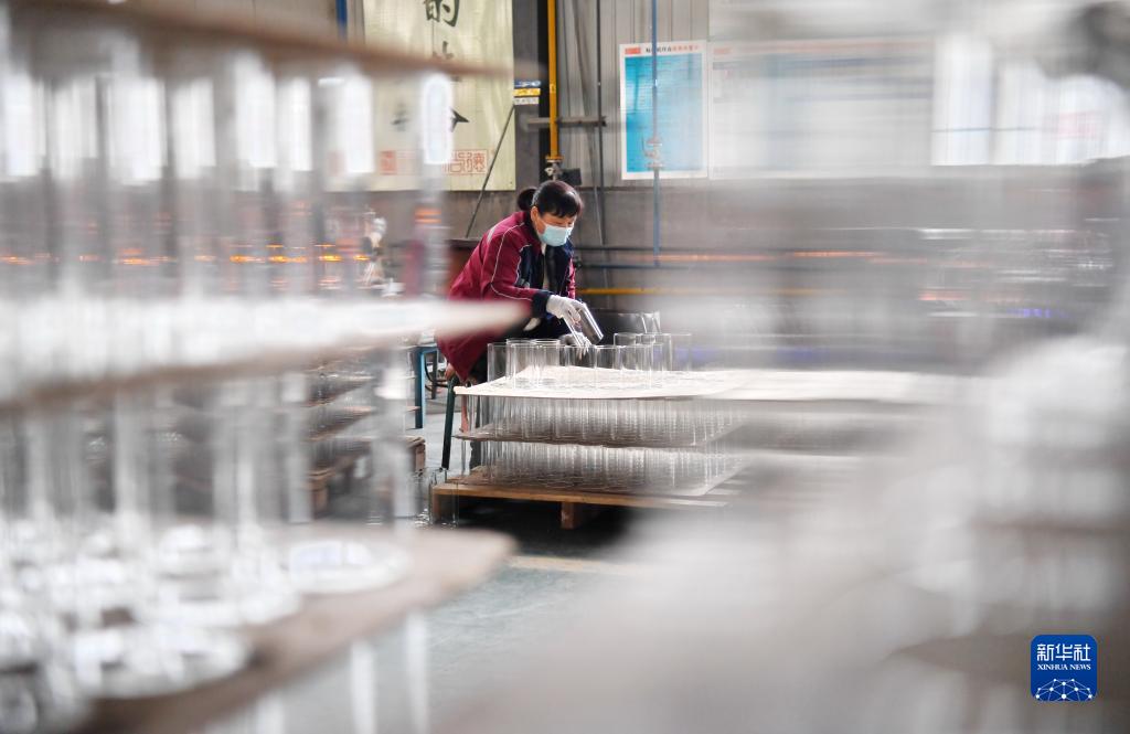 2月11日,河北省河間市一家工藝玻璃制品生產企業工人在車間內整理產品。