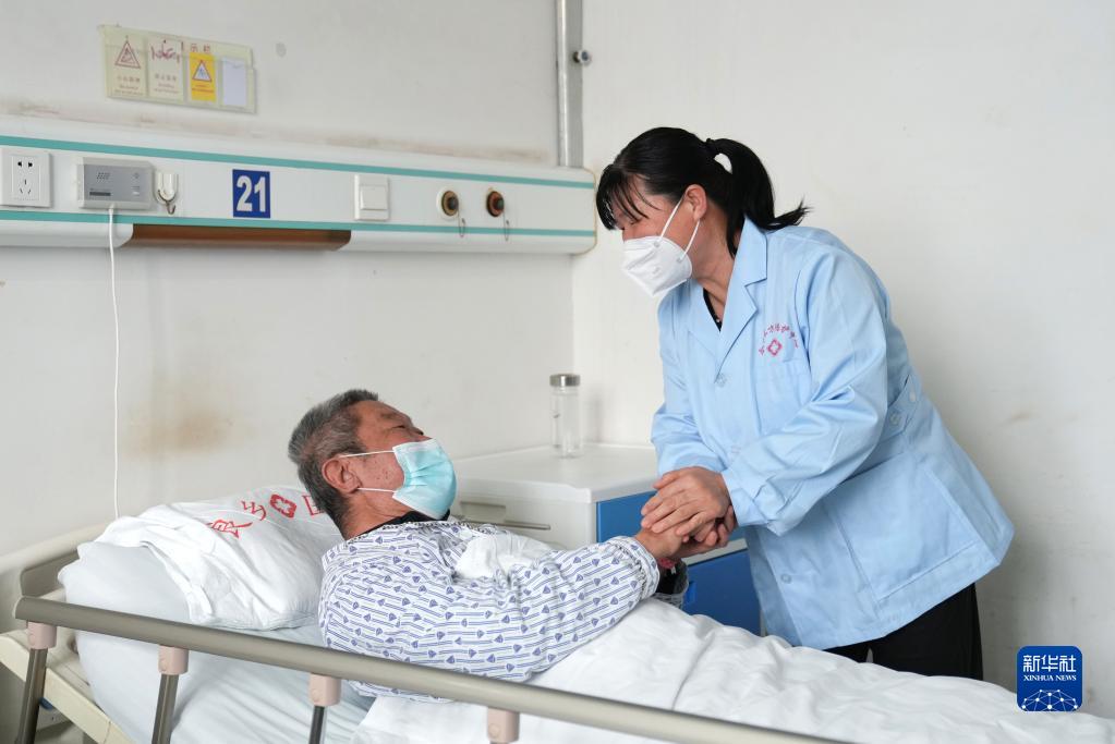 在北京市房山區良鄉醫院神經內科三病區,薛四四(右)與自己照護的患者交流(2月10日攝)。