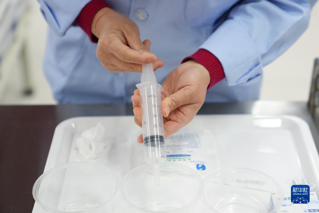 薛四四在北京市今日東方家政服務(wù)公司的護(hù)工崗前培訓(xùn)上練習(xí)飲食照護(hù)操作(2月8日攝)。