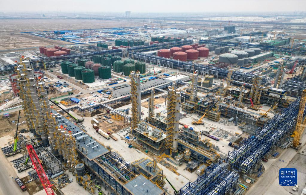 這是2月9日拍攝的天津南港乙烯項目建設施工現場(無人機照片)。