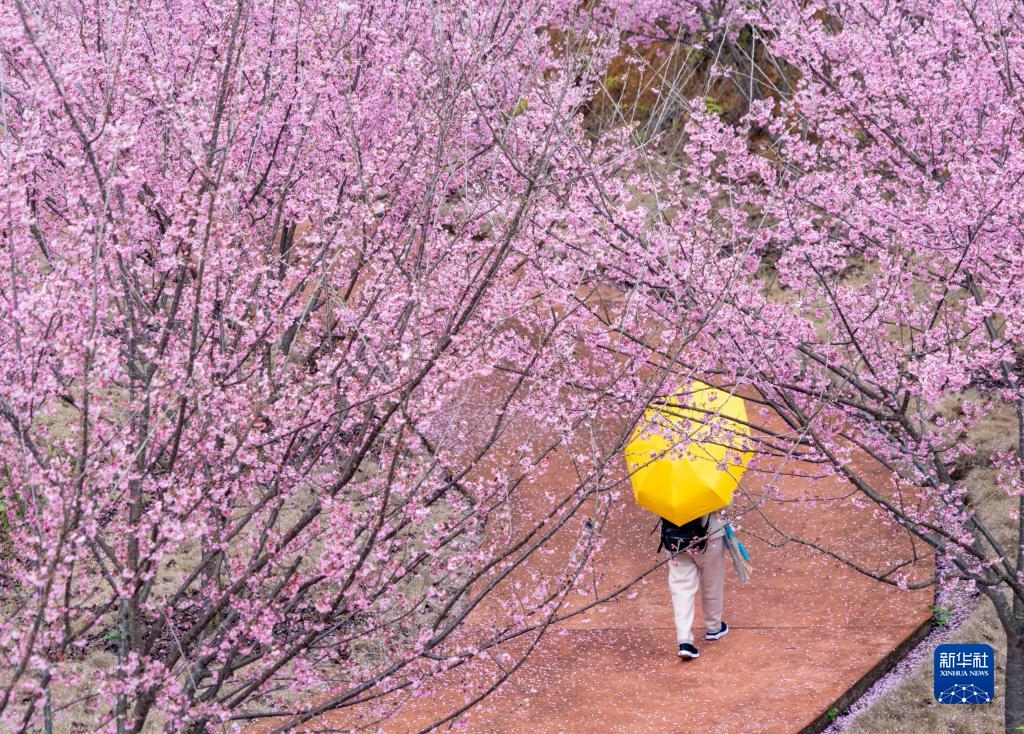2月12日,福建省南靖土樓景區(qū)的紫云山生態(tài)園中,游客撐傘漫步櫻花樹(shù)下。