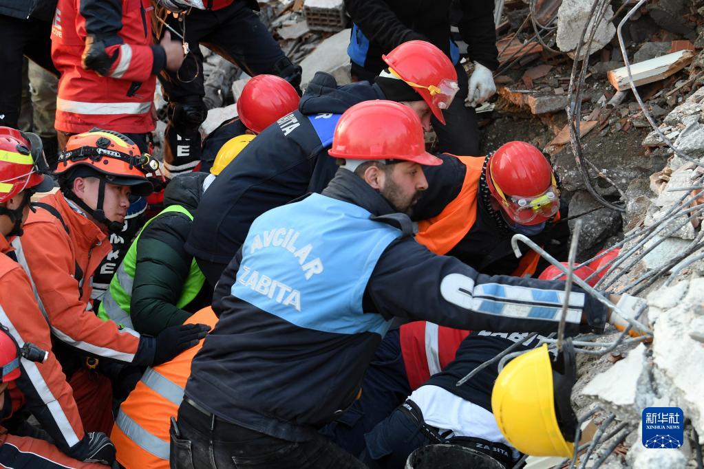 2月11日,包括中國救援隊隊員在內的救援人員在土耳其哈塔伊省安塔基亞市參與搜救。