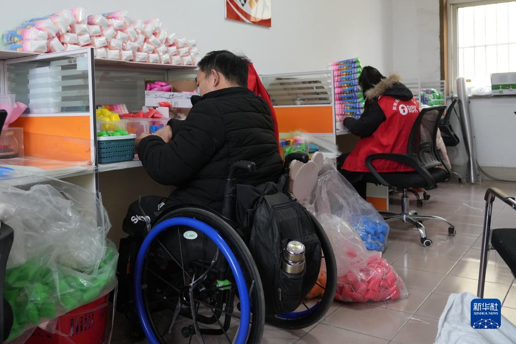 2月12日,在山東鄒城市中心店鎮如康家園內,殘疾人在進行彩色橡皮泥生產加工。