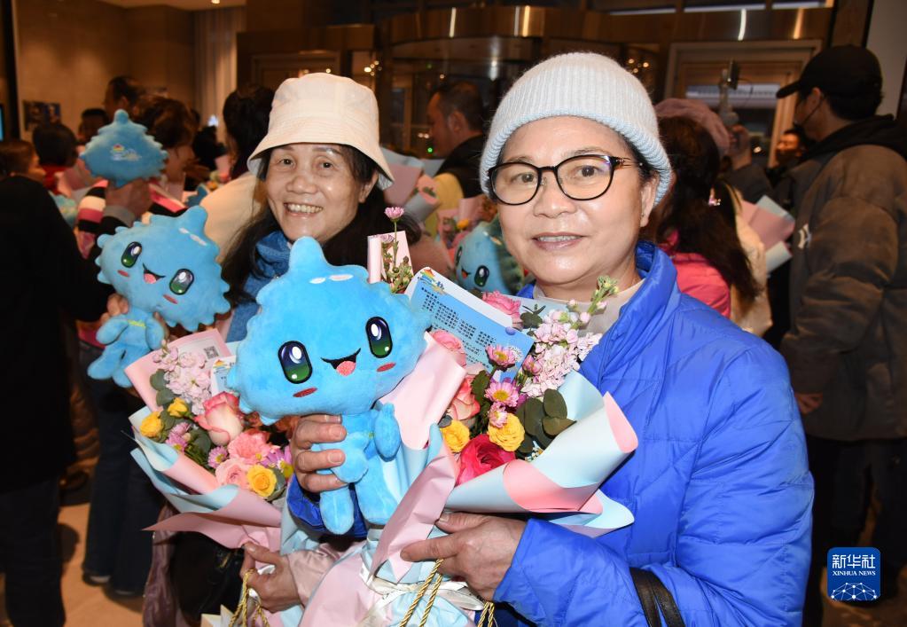 2月12日,來自香港的游客黃麗深(右)在歡迎儀式上展示收到的鮮花和玩偶。