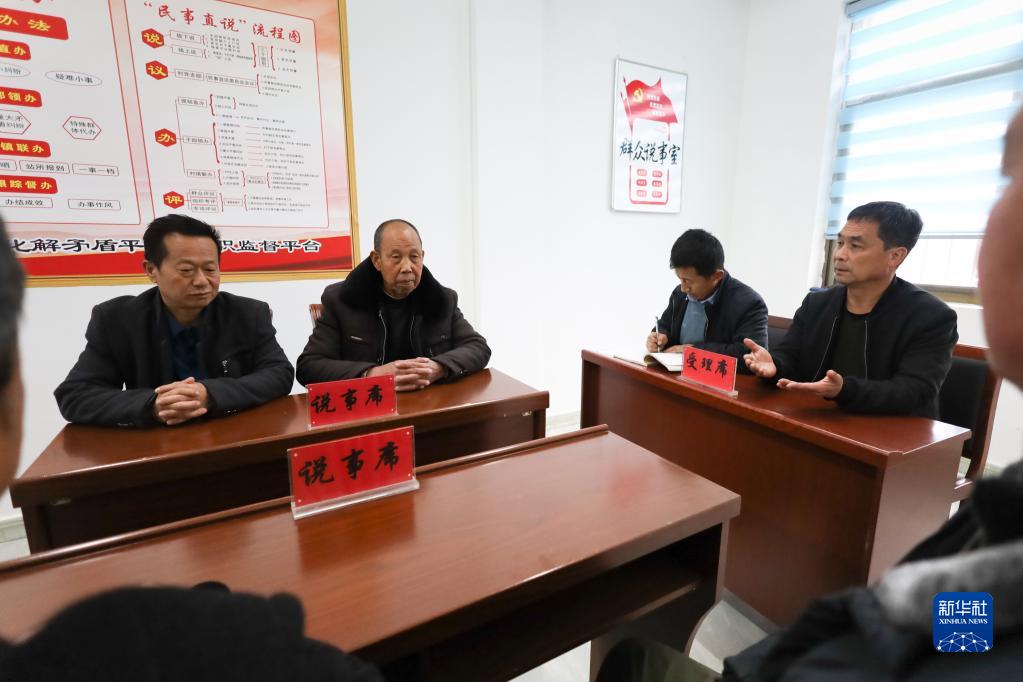 在隴南市徽縣銀杏樹鎮(zhèn)高坪村,“民事直說委員會”成員調(diào)解村民鄰里糾紛(2月11日攝)。