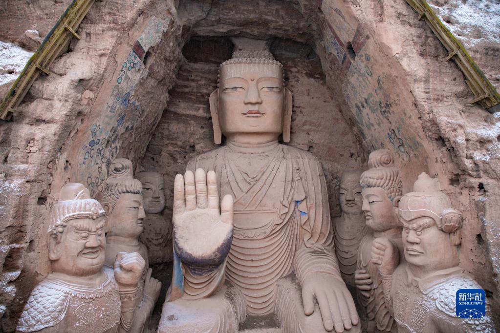 當日,位于甘肅省武威市涼州區的天梯山石窟迎來一場降雪。在皚皚白雪映襯下,窟區造像與原野山川構成一幅寧謐而優美的畫卷。