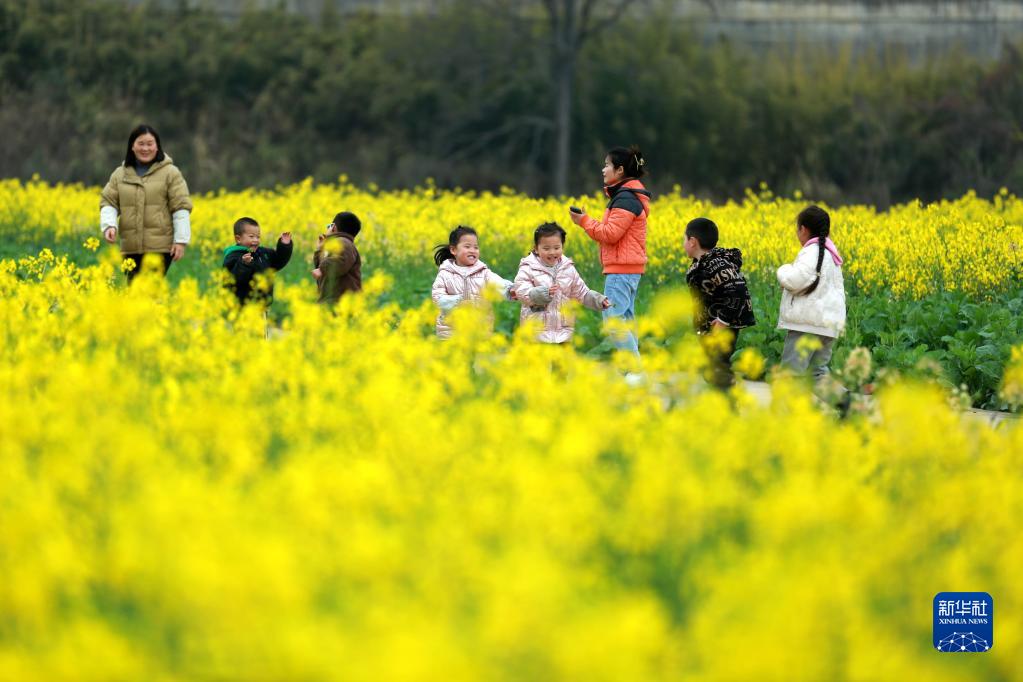 2月12日,游人在貴州省都勻市小圍寨街道馬尾村油菜花田游玩。