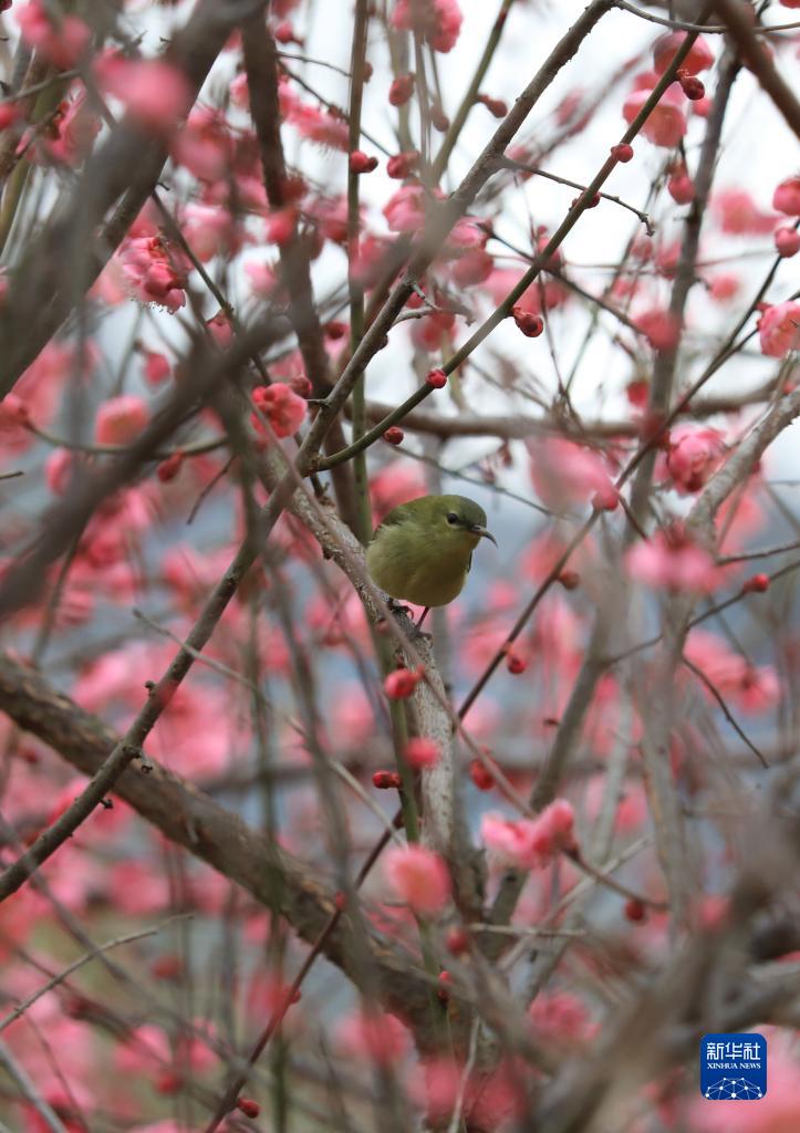 2月12日,鳥兒在貴州省銅仁市江口縣太平鎮(zhèn)云舍村濕地公園梅花叢中棲息。