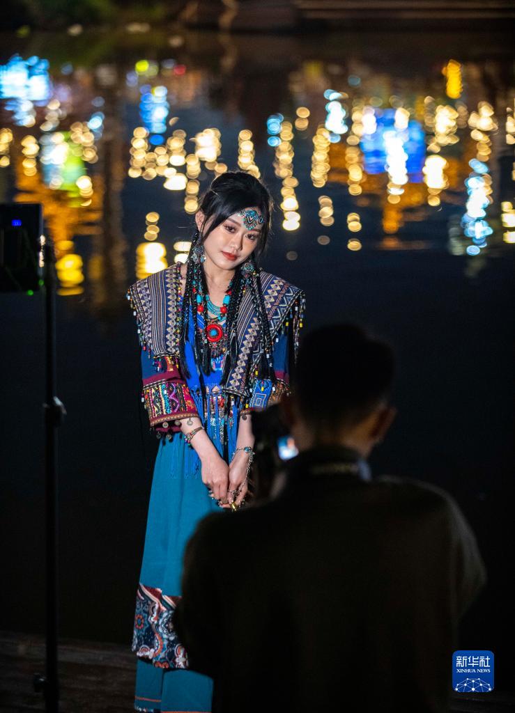 2月12日,游客在告莊西雙景星光夜市旅拍。