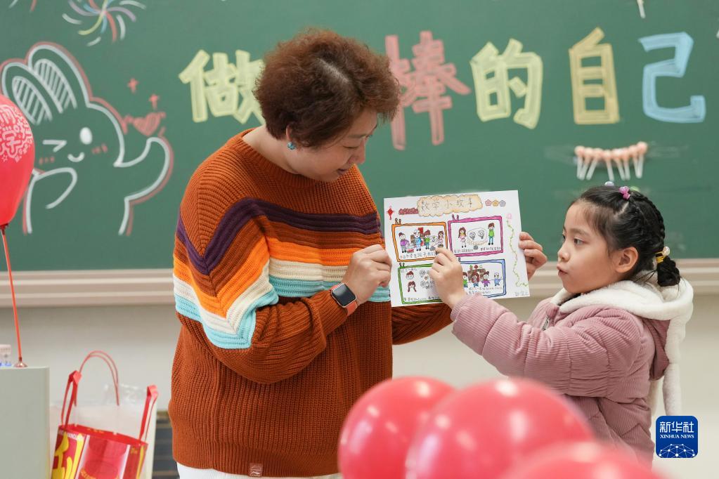2月13日,在北京市朝陽區(qū)芳草地國(guó)際學(xué)校遠(yuǎn)洋小學(xué),一年級(jí)三班的學(xué)生郭宜之(右)在展示寒假作業(yè)。