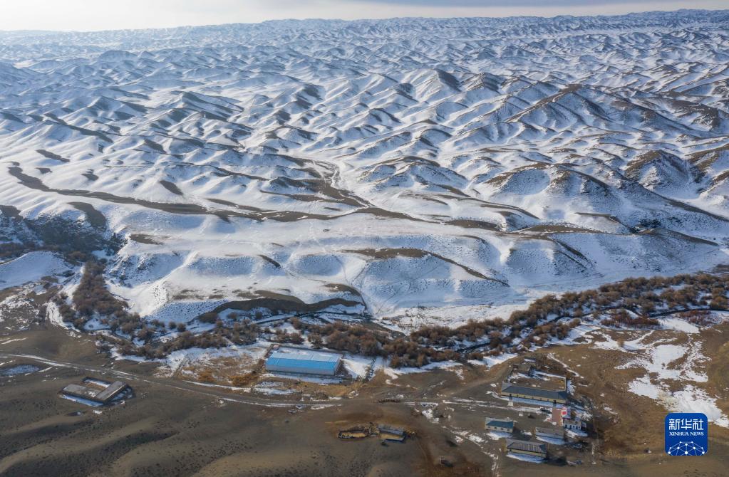 位于新疆巴爾魯克山南坡的裕民縣巴爾魯克牧業(yè)幸福驛站、應(yīng)急飼草料儲(chǔ)備庫、牧業(yè)醫(yī)院(2月12日攝,無人機(jī)照片)。