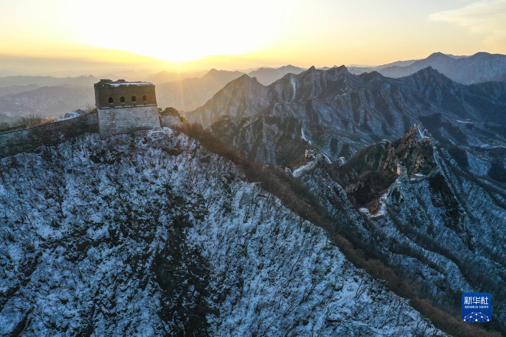 夕陽下的箭扣長城(2月13日攝,無人機照片)。