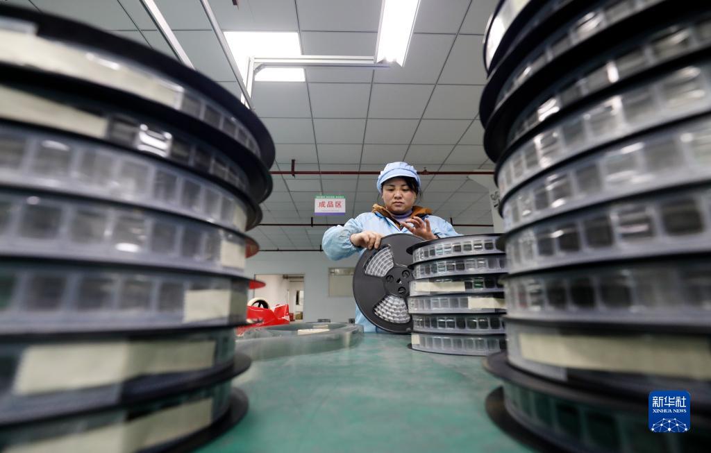 2月14日,湖南資興經濟開發區一家電子公司,工人在自動化生產車間包裝產品。