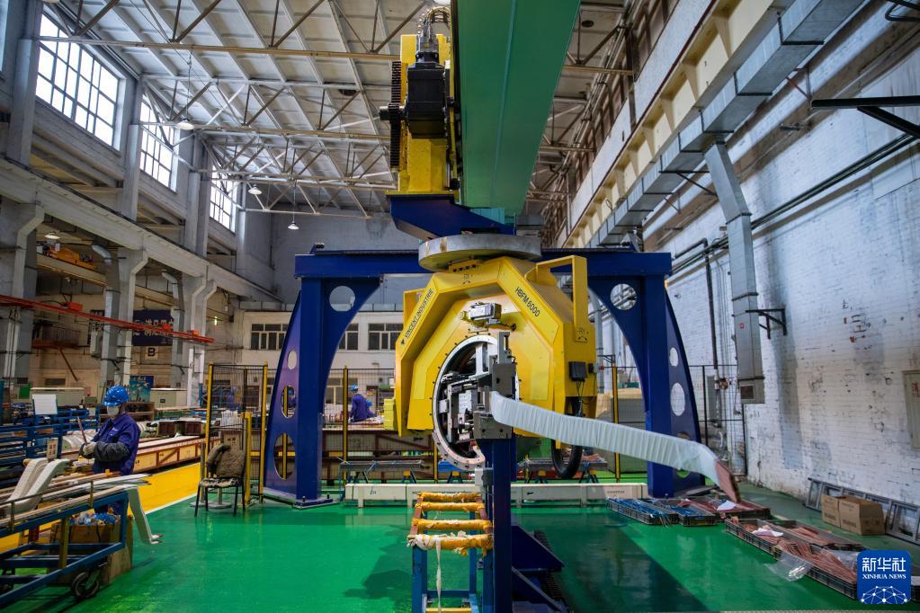 這是2月13日在哈電集團哈爾濱電機廠有限責任公司生產車間內拍攝的正在運行的定子線棒自動成型機。