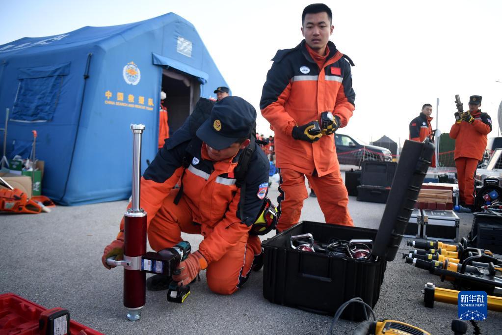 2月11日,在位于土耳其哈塔伊省哈塔伊體育館外的中國救援隊營地,救援隊隊員檢查設備。