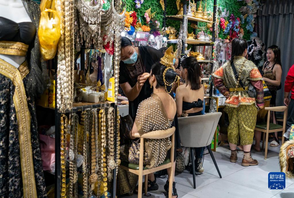 2月12日,一名化妝師在西雙版納州景洪市告莊西雙景星光夜市為準備旅拍的游客化妝。