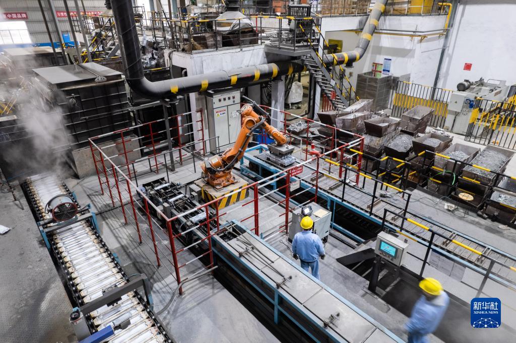 2月14日,在位于株洲市淥口經(jīng)開區(qū)南洲工業(yè)園的湖南株冶火炬新材料有限公司,工作人員在生產(chǎn)鋅基合金產(chǎn)品(無人機照片)。