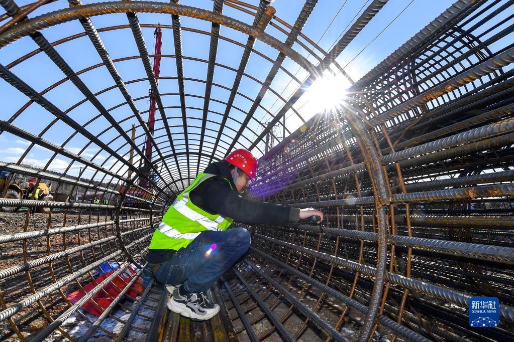 2月14日,工人在由中鐵七局承建的長春市東南湖大路工程一標段二工區進行施工作業。