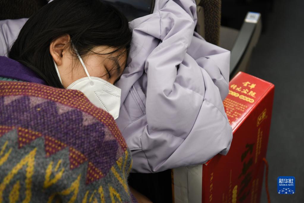 1月14日凌晨,在上海虹橋開往亳州南的G9480次高鐵列車上,一名旅客進入夢鄉(xiāng),身旁擺放著她要帶回老家的年貨。