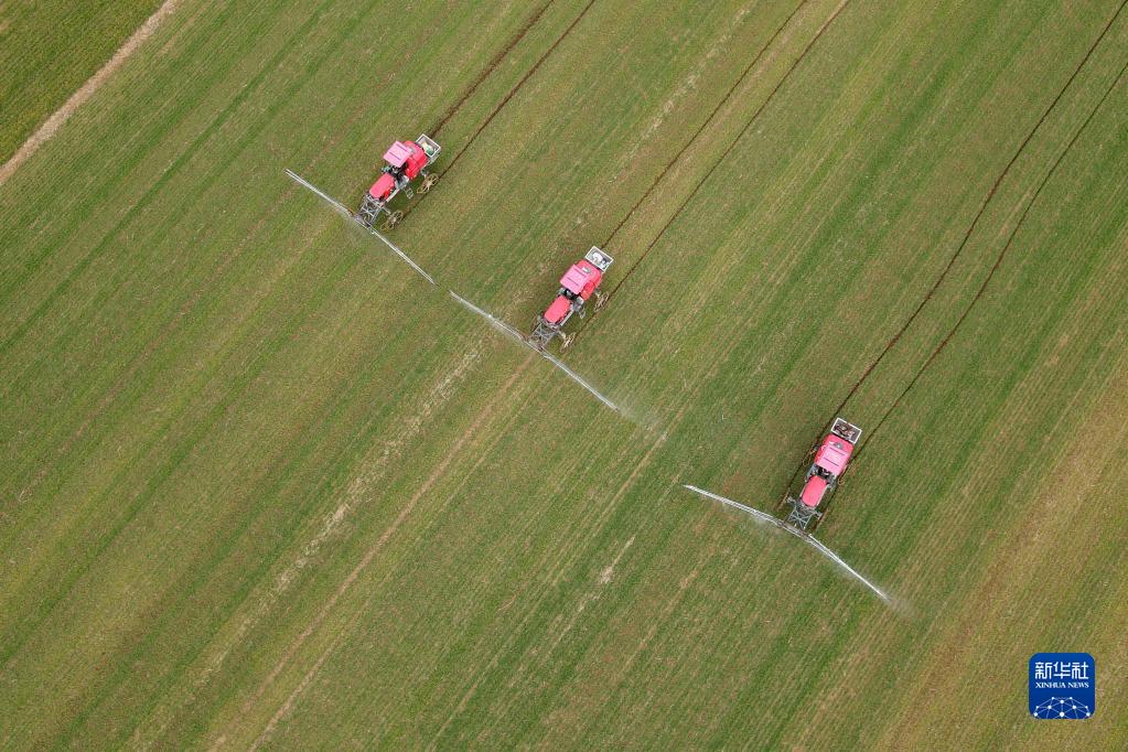 2月14日,在安徽省蚌埠市五河縣頭鋪鎮(zhèn),農(nóng)民駕駛農(nóng)機給小麥噴灑農(nóng)藥(無人機照片)。