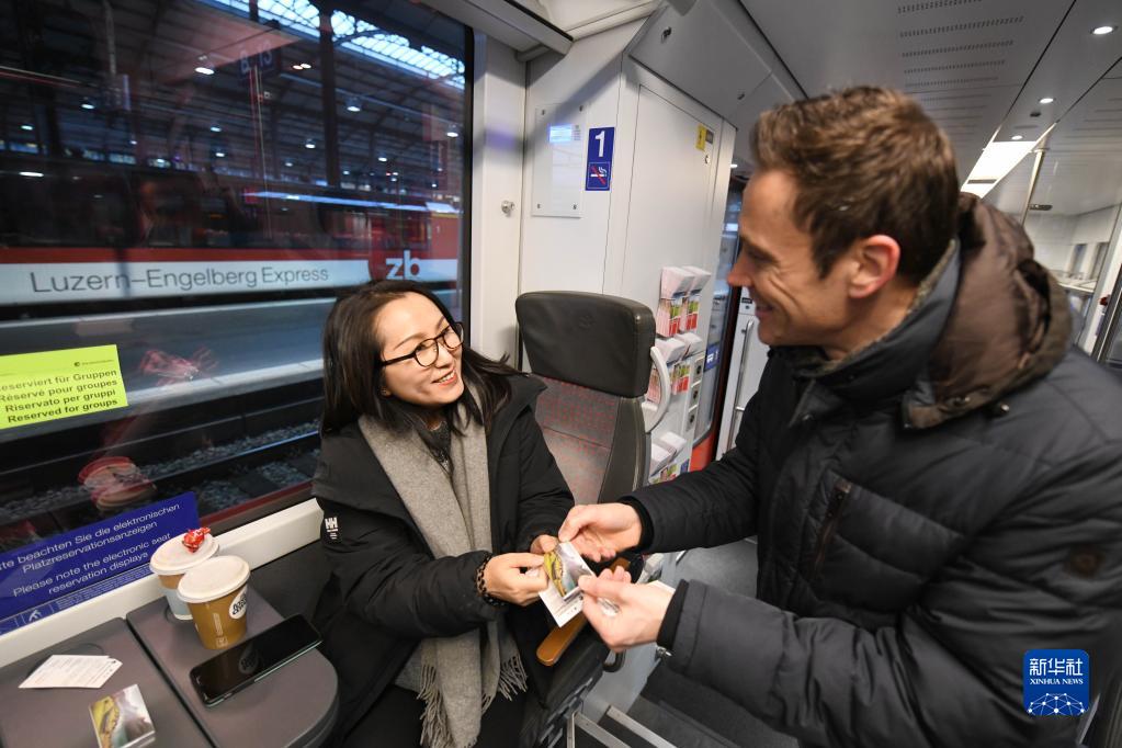 2月14日,在瑞士盧塞恩開往因特拉肯地區的金色山口列車上,瑞士中部鐵路公司工作人員(右)為中國游客發巧克力。