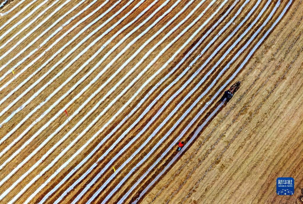 2月14日,廣西柳州市融水苗族自治縣和睦鎮(zhèn)吉塘村村民在甘蔗種落地后用小型農(nóng)機蓋膜(無人機照片)。