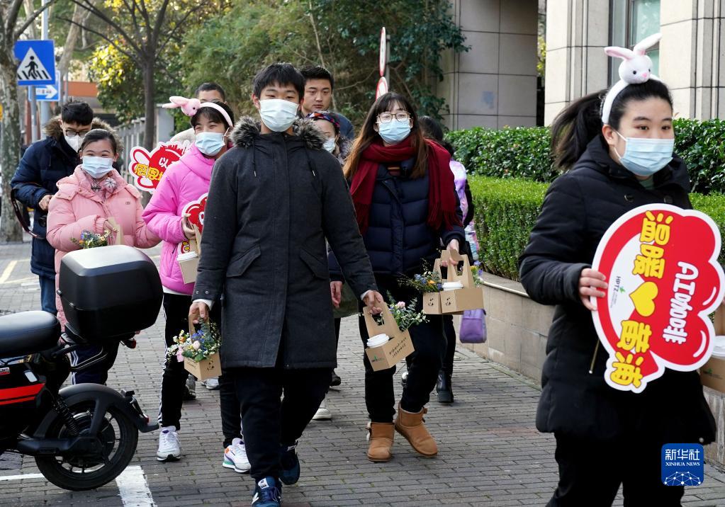 2月15日,黃浦區特殊教育職業學校的學生提著咖啡與花走出校門。
