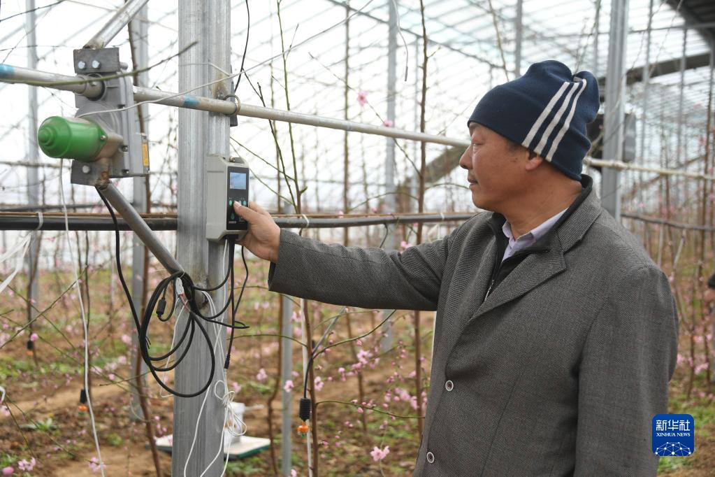 2月15日,在北京市峪口鎮西營村“未來果園”大桃育苗示范基地,果農查看自動通風設備的運行情況。