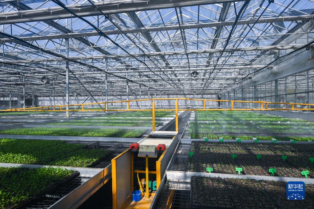 2月15日,在浙江省嘉興市南湖區鳳橋鎮一個有機農業園的育苗大棚內,自動化設備在給菜苗澆水。該農業園配備數字化智慧農業系統,引進農業機器人進行施肥、澆水、翻耕、播種、植保等農事工作。