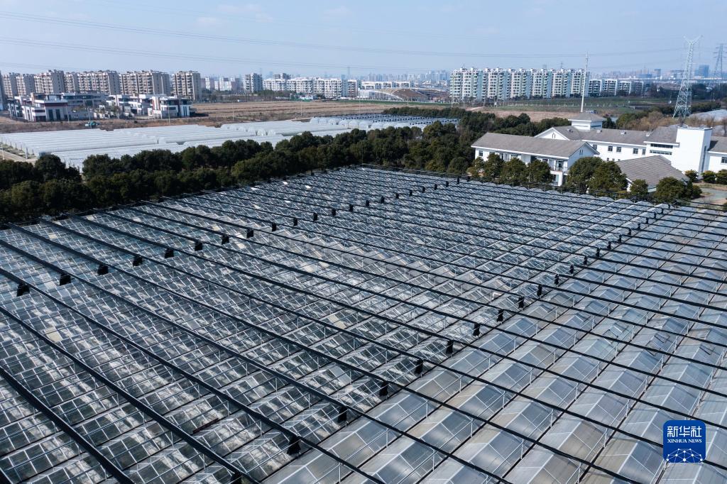 浙江省嘉興市南湖區鳳橋鎮的一家有機農業園的現代化大棚(2月15日攝,無人機照片)。該農業園配備數字化智慧農業系統,引進農業機器人進行施肥、澆水、翻耕、播種、植保等農事工作。