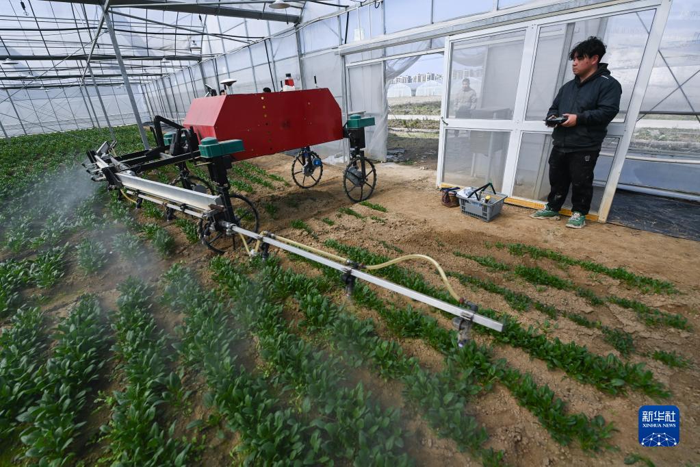 2月15日,在浙江省嘉興市南湖區(qū)鳳橋鎮(zhèn)一個有機農(nóng)業(yè)園的蔬菜大棚內(nèi),工作人員遙控操作植保機器人進(jìn)行施肥作業(yè)。該農(nóng)業(yè)園配備數(shù)字化智慧農(nóng)業(yè)系統(tǒng),引進(jìn)農(nóng)業(yè)機器人進(jìn)行施肥、澆水、翻耕、播種、植保等農(nóng)事工作。