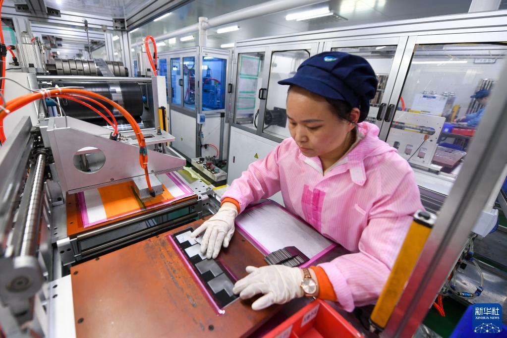 在常州富烯科技股份有限公司生產車間,工人在生產線上生產加工石墨烯導熱膜(2月14日攝)。