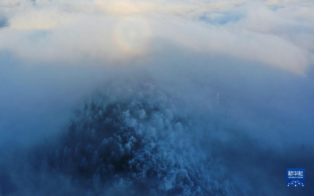 當日,湖南省衡陽市南岳衡山風景區雪后初霽,晶瑩剔透的霧凇在云海里若隱若現,景色如畫。