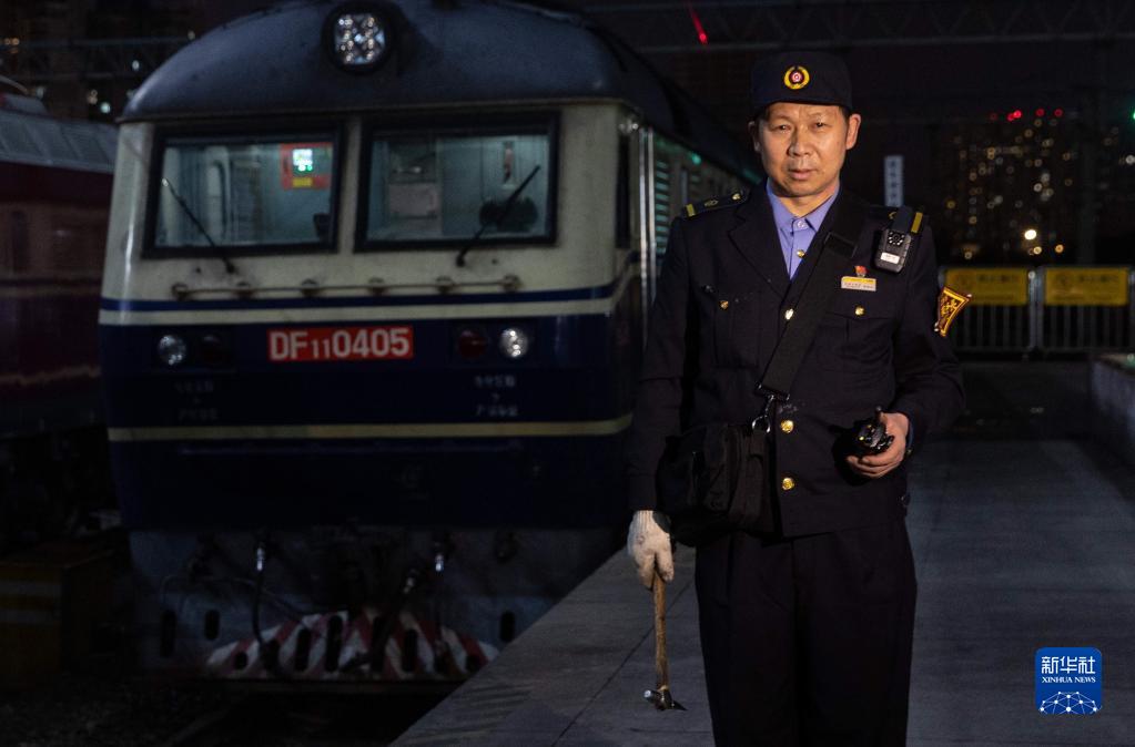 夜色中,K4618次列車緩緩駛出。李金文和同車另一名車輛乘務員凌耀輝每4小時輪換著從車頭到車尾進行一次車廂內巡檢打卡。在沿途安康站、信陽站、蕪湖站、南京站等站的機車調換車頭時間,他們倆還要負責列車一頭一尾,對列車進行“轉交巡”。