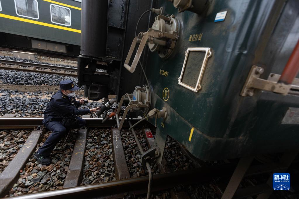 2月14日,列車在信陽站停靠期間,車輛乘務員李金文檢查車廂與機車車頭連接部位的裝置。
