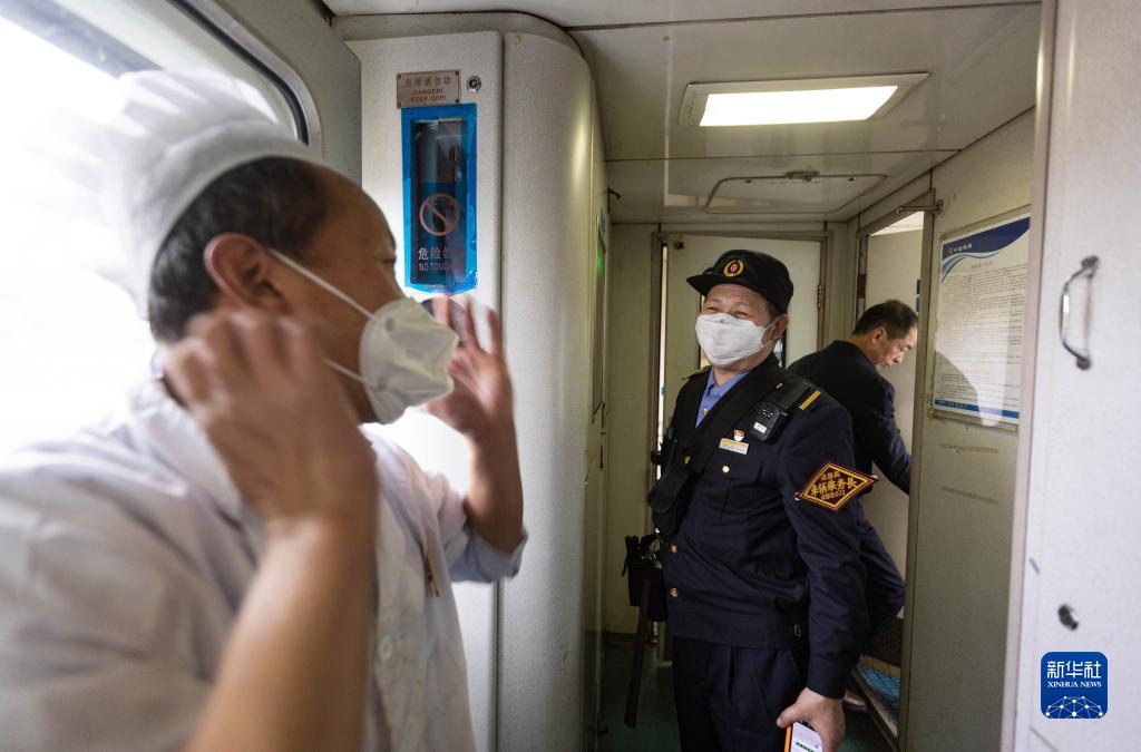 2月13日,車輛乘務員李金文與值乘的廚師同事打招呼。